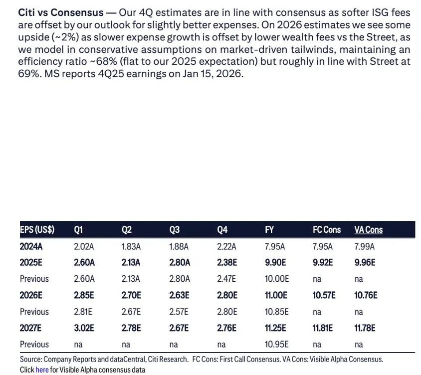 智通财经APP获悉,花旗集团近日发布研报称,华尔街金融巨头摩根士丹利(MS.US)整体质地与业务结构愈发倾向于"高 端/优质"银行与投行金融综合体,但是花旗分析师团队强调,摩根士丹利当前估值已充分反映出"市场一致的最佳投资回 报"预期,因此花旗维持对于大摩股票的"中性"评级,目标价则设定为170美元,意味着在花旗看来,大摩股价短期到中 期时间段将处于显著回调态势。截至周五美股收盘,大摩股价收于181.90美元。 关于即将到来的华尔街金融巨头们2025年第四季度业绩披露期(1月中旬),花旗表示,市场对于大摩的第四季度业绩门槛 预期偏高(尤其投行业务与机构证券业务面临2024年的极高基数),指出当前昂贵的大摩股票价格属于"拥挤的共识多 头",因此大摩Q4业绩可能不及市场一致预期,进而导致股价较当前的历史最高点持续回调;但花旗表示,在费用/成本纪 律支撑下,2026年的整体盈利仍可能较市场一致预期略有上修空间。 花旗认为市场已在定价"best-in-class returns(同业最优投资回报)",体现为股票价格在其"隐含股权资本成本"框架下呈现 显著溢价;在这种估值状态下,花旗认为基于当前大摩股票价格的风险/回报 ...