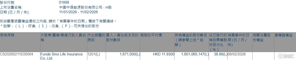 格隆汇2月11日丨根据联交所最新权益披露资料显示,2026年2月9日,中煤能源(01898.HK)遭Funde Sino Life Insurance Co.,Ltd.在场内以每股均价11.93港元减 持167.1万股,涉资约1993.5万港元。 | 表格序號 | 大股東/董事/最高行政人員名 作出披露的 買入 / 賣出或涉及的 每股的平均價 | | 持有權益的股份數目 佔已發行的有關事件的日 相關法 | | --- | --- | --- | --- | | | 原因 | 股份數目 | ねんばし題め船。 有投票權股 期(日/月/ 份權益 | | | | | 仿自分比 | | CS20260211E00004 | Funde Sino Life Insurance 1201(L) 1,671,000(L HKD 11.9300 | | 1,601,065,147(L) 38.99(L) 09/02/2026 | | | Co.,Ltd. | | | 减持后,Funde Sino Life Insurance Co.,Ltd.最新持股数目为1,601,065,147股,持股比例由39.03%下降至38.99%。 ...