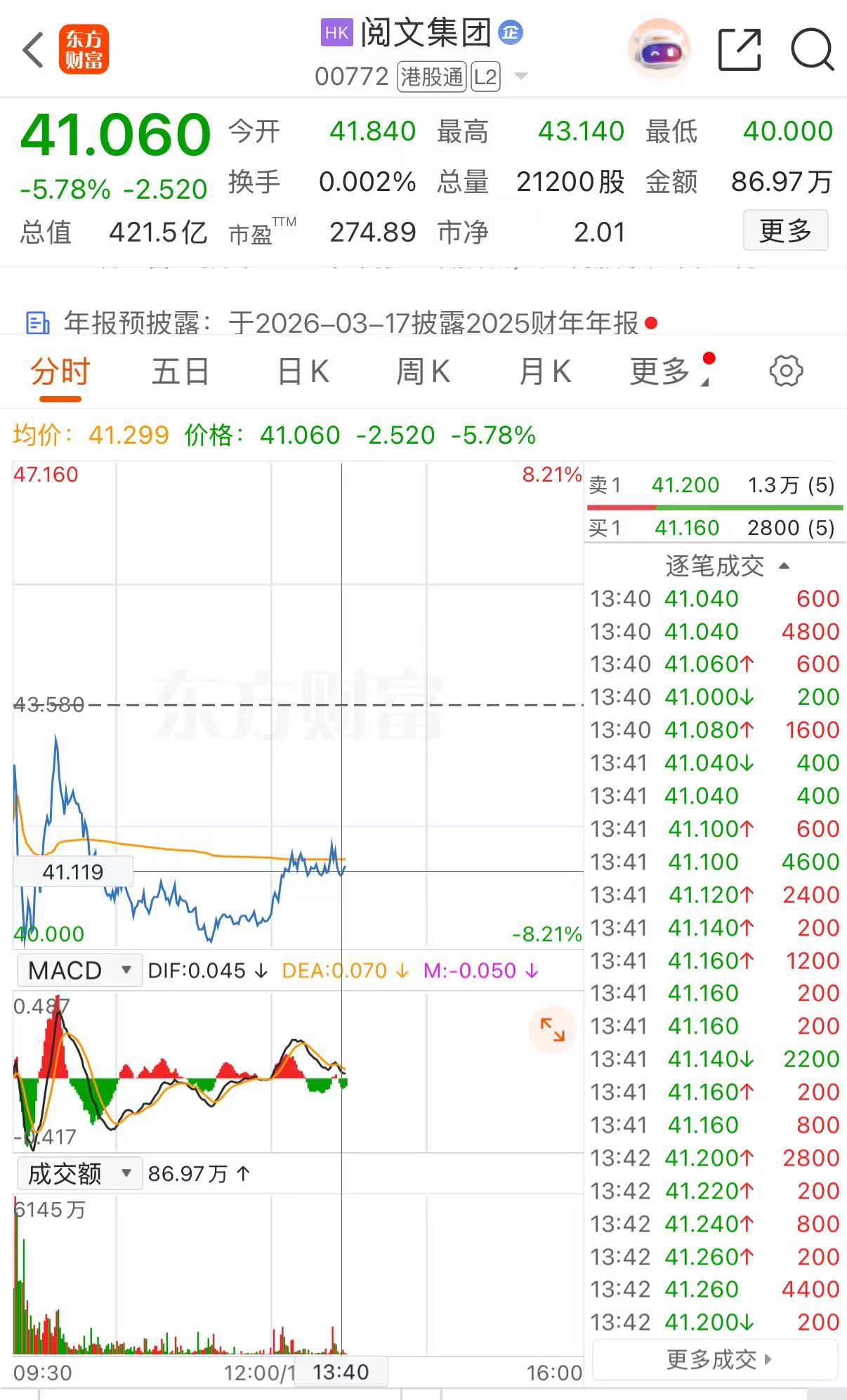 港股异动 | 阅文集团一度跌超8% 此前发布盈利预警