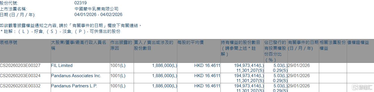 增持后,FIL Limited最新持好仓数目为194,973,414股,持好仓比例由4.98%上升至5.03%。 | 股份代號: | 02319 | | --- | --- | | 上市法國名稱: | 中國蒙牛乳業有限公司 | | 日期 (日 / 月 / 年): | 04/01/2026 - 04/02/202 | 格隆汇2月4日丨根据联交所最新权益披露资料显示,2026年1月29日,蒙牛乳业(02319.HK)获FIL Limited在场内以每股均价16.4611港元增持好仓188.6万股, 涉资约3104.56万港元。 | 表格序號 | | 大股東/董事/最高行政人員名 作出披露的 買入 / 賣出或涉及的 每股的平均價 | | | | | 持有權益的股份數目 佔已發行的 有關事件的日期有 | | --- | --- | --- | --- | --- | --- | --- | --- | | | 播 | 農大 | 股份數目 | | | (語參閱上述*註 | 有投票權股 (日 / 月 / 年) | | | | | | | | | 份自分市 | | | | | | | | | : 96 ) | | CS20 ...