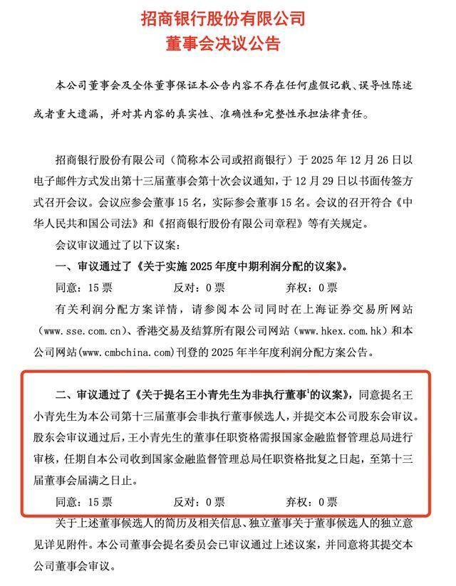 瑞财经 吴文婷12月29日,招商银行发布董事会决议公告,审议通过了《关于提名王小青先生为非执行 董事的议案》,同意提名王小青为公司第十三届董事会非执行董事候选人,并提交公司股东会审议。 股东会审议通过后,王小青的董事任职资格需报国家金融监督管理总局进行审核,任期自公司收到国家 金融监督管理总局任职资格批复之日起,至第十三届董事会届满之日止。 值得关注的是,今年8月4日,招商银行发布公告称,公司董事会收到公司副行长王小青的辞任函。王小 青因工作原因,向公司董事会提请辞去副行长职务。王小青的辞任自当日起生效。 其曾任中国人保资产管理有限公司风险管理部副总经理、组合管理部副总经理、组合管理部总经理、总 裁助理、副总裁兼财务负责人,招商基金管理有限公司总经理、董事长,招商银行行长助理兼深圳分行 行长,招商银行副行长,曾兼任招商信诺人寿保险有限公司董事长,兼任招商信诺资产管理有限公司董 事长。 | 姓名 | 离任职务 | 离任时间 | 原定任期 | 离任原因 | 是否继续在 本公司及其控股 | 是否存在 未履行完毕 | | --- | --- | --- | --- | --- | --- | --- | | | | ...