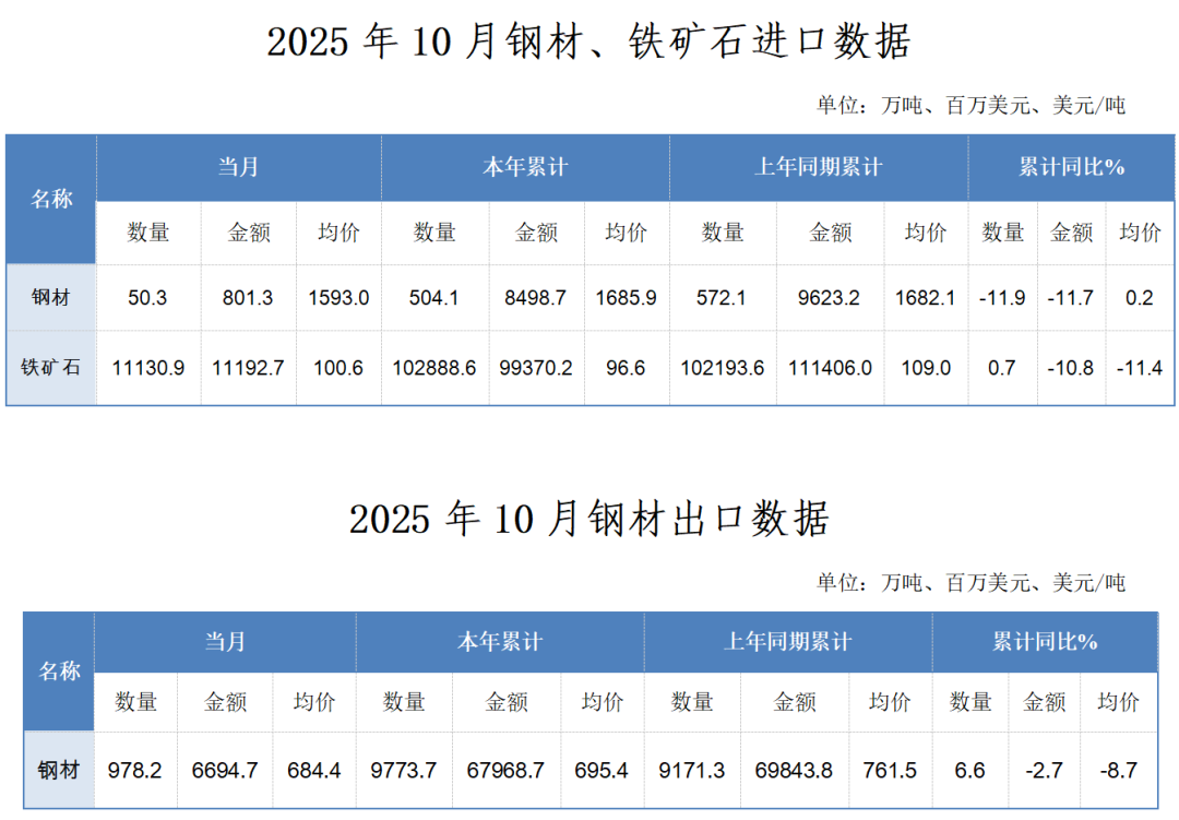 Summary of Key Points Core Viewpoint - In October 2025, China's steel exports decreased while imports showed a decline, with iron ore imports experiencing a slight increase year-on-year. The overall trend indicates a mixed performance in the steel industry, with exports up year-to-date but a drop in the latest month. Steel Exports - In October 2025, China exported 978.2 million tons of steel, a decrease of 68.3 million tons or 6.5% month-on-month. The average price was $684.4 per ton, an increase of $5.3 per ton or 0.8% [1] - From January to October 2025, cumulative steel exports reached 9,773.7 million tons, an increase of 602.4 million tons or 6.6% year-on-year [1][5] Steel Imports - In October 2025, China imported 50.3 million tons of steel, a decrease of 4.5 million tons or 8.2% month-on-month. The average price was $1,593.0 per ton, a decrease of $31.1 per ton or 1.9% [1] - From January to October 2025, cumulative steel imports totaled 504.1 million tons, a decrease of 68.0 million tons or 11.9% year-on-year [1][3] Iron Ore Imports - In October 2025, China imported 11,130.9 million tons of iron ore, a decrease of 501.7 million tons or 4.3% month-on-month. The average price was $100.6 per ton, an increase of $3.6 per ton or 3.7% [1] - From January to October 2025, cumulative iron ore imports reached 102,888.6 million tons, an increase of 695.0 million tons or 0.7% year-on-year [1][3]