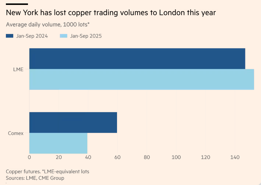 特朗普反复无常的贸易政策,意外为伦敦金属交易所(LME)赋予了超越纽约竞争对手的优势。 分析师表示,这位美国总统对进口铜时断时续地征收关税,导致纽约商品交易所(Comex)铜价剧烈波动,并持续扭曲远期交割价格——因为该交易所的合 约包含了在美国需缴纳的所有关税或其他税费。 相比之下,在全球最大的基本金属交易所LME,交易的铜存储在全球各地的保税仓库中,尚未产生纳税义务。正如其首席执行官马修·张伯伦(Matthew Chamberlain)所言,LME能提供"不受关税波动影响的纯净全球价格"。 这一差异促使大量交易业务转向伦敦。过去三年,LME一直在努力从2022年镍危机的重创中恢复,而今年其核心基本金属合约交易量已出现增长。截至目 前,铜期货日均交易量较2024年同期上升4%。 与此同时,作为芝加哥商品交易所集团(CME Group)旗下规模较小的交易所,Comex今年前9个月的铜期货日均交易量较去年同期下降34%,这在很大程 度上是由关税不确定性导致的。 LME和Comex今年前9个月的铜期货日均交易量与去年同期的对比 交易员最初预计特朗普的关税将覆盖精炼铜,但7月底宣布的政策却将其排除在外;更令市场意外的 ...