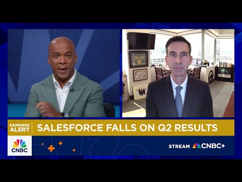 All right, let's get another check on Salesforce. Those shares are falling post earnings off the lows but still down about three and a half% despite reporting a beat on earnings and revenue for the second quarter. Joining us now is Gil Lauria from DA Davidson.Gil, is this a case of whiplash where uh Salesforce was getting criticized for being inefficient, but now the market's attention has turned to growth. And despite what Beni off said about this being a year of AI, the growth numbers aren't quite measuri ...