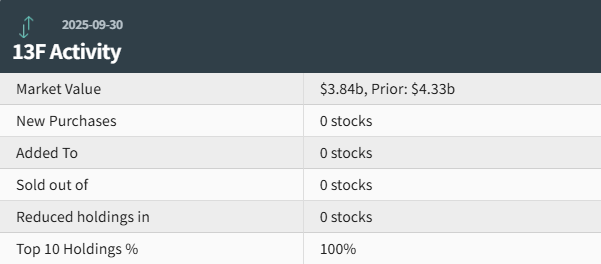 据统计,该基金第三季度持仓总市值为38.4亿美元,上一季度总市值为43.3亿美元,环比减少13%。该基金在第三季度的持仓组合 中未新增、增持个股,也未清仓、减持个股。前十大持仓标的占总市值的100%。 | 2025-09-30 | | | --- | --- | | 13F Activity | | | Market Value | $3.84b, Prior: $4.33b | | New Purchases | 0 stocks | | Added To | 0 stocks | | Sold out of | 0 stocks | | Reduced holdings in | 0 stocks | | Top 10 Holdings % | 100% | 根据美国证券交易委员会(SEC)披露,英伟达递交了截至2025年9月30日的第三季度持仓报告(13F)。 英伟达在最新的SEC申报文件中披露的总持仓数为6,其中,CoreWeave(CRWV.US)位列第一,持仓约2427.76万股,持仓市值约 33.22亿美元,占投资组合比例为86.44%,持仓数量未改变。 加密资产挖矿和矿机共同托管服务公司App ...