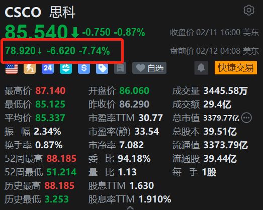 | CSCO 思科 | | | | --- | --- | --- | | 85.540 4 -0.750 -0.87% | | 收盘价 02/11 16:00 美东 | | 78.920 + -6.620 -7.74% | | 盘前价 02/12 04:08 美东 | | 三月24日 9 日 9 日 2 日 2 日 2 日 2 日 2 日 2 日 2 日 2 日 2 日 2 日 2 日 2 日 2 日 2 日 2 日 2 日 2 日 2 日 2 日 2 日 2 日 2 日 2 日 日 2 日 2 日 日 1 | | ● 快捷交易 | | 最高价 87.140 | 开盘价 86.060 | 成交量 3445.58万 | | 最低价 85.125 | 昨收价 86.290 | 成交额 29.4亿 | | 平均价 85.337 | 市盈率 M 30.77 | 总市值 3379.77亿(…) | | 振 幅 2.34% | 市盈率(静) 33.54 | 总股本 39.51亿 | | 换手率 0.87% | 市净率 7.082 | 流通值 3373.79亿 | | 52周最高 88.185 | 委 比 94.18% ...