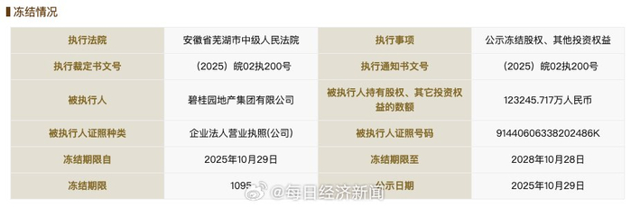 Core Viewpoint - Country Garden Real Estate Group has had 1.23 billion RMB worth of equity frozen, with a freeze period of three years, as per the announcement from the National Enterprise Credit Information Publicity System [1] Group 1: Company Information - Country Garden Real Estate Group was established in April 2015, with a registered capital of approximately 15.32 billion RMB [1] - The company is involved in real estate development and sales, property leasing, and real estate investment consulting [1] - The shareholders of the company include Foshan Shunde District Zhouhua Investment Consulting Co., Ltd. and Shenzhen Country Garden Technology Development Co., Ltd. [1] Group 2: Legal and Financial Details - The equity freeze involves the company’s holdings in Foshan Yuankang Real Estate Development Co., Ltd., with the frozen amount being 1,232.45717 million RMB [1] - The freezing order was issued by the Intermediate People's Court of Wuhu City, Anhui Province, with the freeze effective from October 29, 2025, to October 28, 2028 [1] - The execution notice and ruling document numbers related to this case are (2025) Wan 02 Zhi 200 and (2025) Wan 02 Zhi 200 respectively [1]