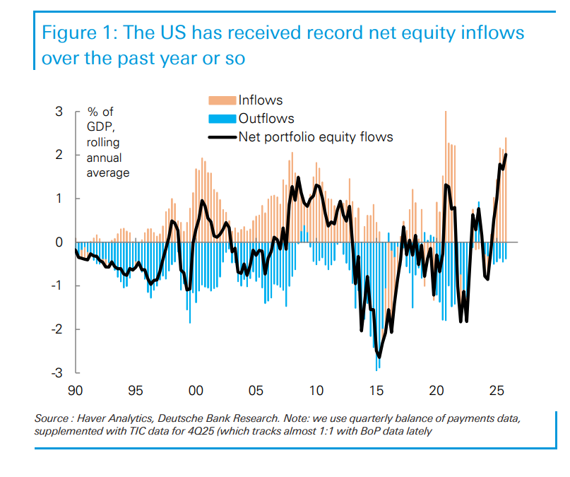占GDP 2%的资金涌入美股 "美国股市在全市场受追捧的程度令人难以置信。净股票流入从未如此强劲。"Tim Baker在报告中直言,"在整个 2025年,净流入资金达到了令人瞠目结舌的占美国GDP 2%的水平。" 这是一个极其庞大的数字。德银指出,仅凭这笔创纪录的股票净流入资金,就足以单枪匹马地为美国三分之二的经 常账户赤字提供融资。 在这场资本盛宴中,不仅他国投资者在疯狂买入美股,美国本土投资者也展现出了极强的"本土偏好"。报告显示, 美国投资者购买外国股票的意愿处于疲软状态。在过去的一年半里,美国在G10国家中显得格格不入。除了英国勉 强接近外,绝大多数G10国家都经历了股票资金的净流出。 美股正遭遇"买得越多,跑得越输"的尴尬境地,德意志银行警告称,一旦美股创纪录的外资流入发生逆转,美元将 面临严峻的下行风险。 据追风交易台,2月25日,德意志银行宏观策略师Tim Baker发布报告显示,尽管全球资金正在以史无前例的速度涌 入美国股市,但美股的相对表现却令人大跌眼镜。"美国市场却落后了——表现更好的是更便宜、更具周期性的市 场。" 在德银看来,关键不只是股市排名变化,而是它可能触发一个更大的链条:海外投 ...