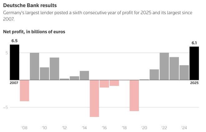 Core Viewpoint - Deutsche Bank reported record profits for Q4 2025, with a net income of €1.3 billion ($1.56 billion), exceeding analyst expectations of €1.12 billion [1][5]. Financial Performance - Q4 total revenue reached €7.73 billion, a 7.1% increase year-over-year, aligning closely with LSEG's estimate of €7.72 billion [1]. - The bank's net profit for 2025 was €6.12 billion ($7.3 billion), significantly higher than the previous year's €2.7 billion and slightly above analyst expectations of nearly €6 billion [1]. - Earnings per share for Q4 were €0.76, surpassing the market expectation of €0.55 [1]. Dividend and Share Buyback - Management plans to propose a dividend of €1 per share for 2025 at the annual shareholder meeting in May 2026, totaling €1.9 billion, a 50% increase from the previous year's dividend of €0.68 per share [5]. - The bank announced a €1 billion share buyback plan, which, combined with the dividend, will result in a payout of 50% of last year's profits [5]. Business Segment Performance - Fixed income and foreign exchange trading revenue grew by 6% year-over-year, marking the best Q4 performance ever, exceeding the expected 4% growth [5]. - Despite strong trading performance, consulting and loan issuance declined by 4%, partially offsetting the overall growth [6]. Legal and Regulatory Challenges - The bank faced a regulatory raid related to a money laundering investigation, which overshadowed its strong performance [7]. - The investigation is focused on transactions involving bank employees and companies linked to sanctioned individual Roman Abramovich from 2013 to 2018 [7]. Future Outlook - Deutsche Bank expects revenue to rise to approximately €33 billion in 2026, driven by growth in loans and fees [8]. - The bank's CET1 capital ratio for Q4 was 14.2%, slightly down from 14.5% in the previous quarter but up from 13.8% year-over-year [9]. - The bank's three-year financial plan concluded in 2025, achieving a tangible equity return target of over 10% [9].