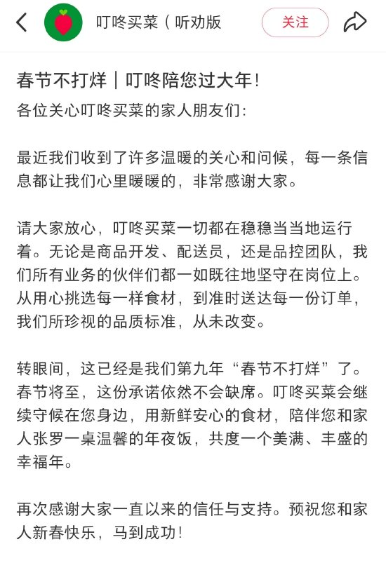 叮咚买菜回应“收购”消息:业务正常运营、品质标准不变,连续九年春节不打烊
