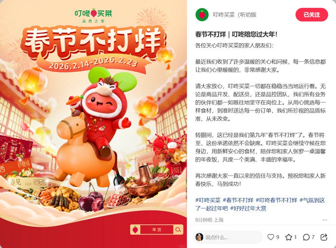 凤凰网科技讯2月9日,叮咚买菜通过小红书官方账号发布公告,宣布在2026年春节期间将继续实行"春 节不打烊"服务。公司表示,所有业务环节包括商品开发、配送及品控等岗位均将正常运转,维持食材 挑选与订单配送的标准。 叮咚买菜在公告中称,该公司推行春节不打烊服务已进入第九年,公司同时向用户致以春节问候。 此前,叮咚买菜因被美团收购受到部分用户关注,创始人梁昌霖发布全员信回应表示,"大家仍会有非 常稳定的发展平台"。 ...