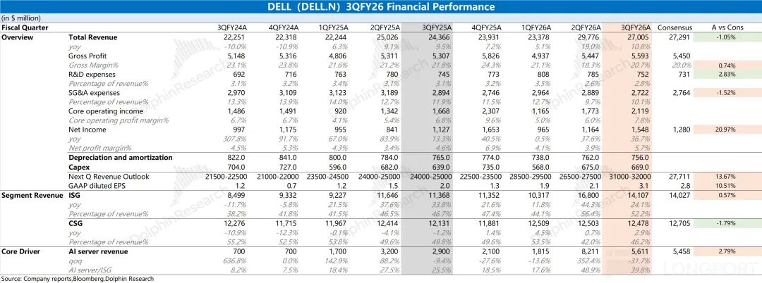 Core Performance - Dell Technologies reported Q3 FY26 revenue of $27 billion, a year-over-year increase of 10.8%, close to market expectations of $27.3 billion, with nearly $2.7 billion of the increase attributed to AI server shipments [1][15] - The gross margin for the quarter was 20.7%, down 1.1 percentage points year-over-year, slightly better than the market expectation of 20% [1][16] - The Infrastructure Solutions Group (ISG) revenue was $14.1 billion, a year-over-year increase of 24%, meeting market expectations [26][29] AI Server Business - AI server revenue for the quarter was approximately $5.6 billion, aligning with market expectations [1][31] - The backlog for AI server orders reached $18.4 billion, with projections for next quarter's AI server revenue to be around $9.4 billion, significantly exceeding market expectations [1][4][29] Client Solutions Group (CSG) - CSG revenue was $12.5 billion, a year-over-year increase of 3%, but below market expectations of $12.7 billion [30] - Commercial customer revenue was $10.6 billion, up 5% year-over-year, while personal consumer revenue fell 7% to $1.86 billion [30][35] Future Guidance - The company raised its Q4 revenue guidance to $31-32 billion, up from previous guidance of below $29 billion, driven by AI business growth [1][4] - The projected GAAP EPS for the next quarter is $3.1, reflecting growth primarily from AI business [1][4] Cost and Profitability - Operating expenses for the quarter were $3.47 billion, down 5% year-over-year, with a reduction in sales and management costs due to the low performance of traditional businesses [18][20] - Core operating income was $2.12 billion, a 27% increase year-over-year, with a core profit margin of 7.8% [20][22] Market Context - The company previously raised its long-term revenue guidance for FY26-30 from 3-4% to 7-9%, which initially boosted stock prices [5] - Concerns over rising storage costs and potential impacts on PC business have led to cautious market expectations [8][10]