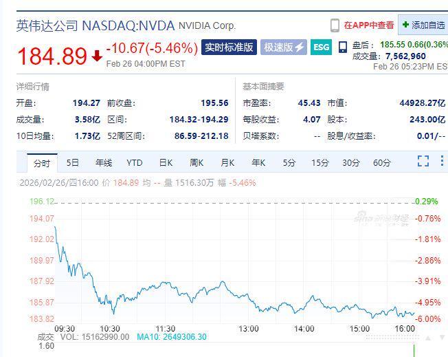 Group 1: Market Performance - On February 26, US stock indices closed mixed, with the Nasdaq down 1.18%, S&P 500 down 0.54%, and Dow Jones up 0.03% [2] - Major tech stocks mostly declined, with Nvidia dropping over 5%, marking its largest single-day decline since April 16 of the previous year, resulting in a market value loss of $259.3 billion (approximately 1773.9 billion RMB) [2] Group 2: Nvidia Analysis - Analysts noted that despite Nvidia's revenue, net profit, and guidance exceeding expectations, investors did not exhibit excessive enthusiasm due to concerns about the company's diminishing competitive edge in an evolving computing landscape [4] - There are worries regarding Nvidia's ability to maintain its impressive growth rate as core customers, particularly large-scale cloud service providers, are consuming most of their cash flow through AI-related capital expenditures [4][5] Group 3: Dell Technologies Performance - Dell Technologies reported a total net revenue of $33.38 billion for Q4, surpassing analyst expectations of $31.74 billion [5] - The company’s AI server shipments reached $9.5 billion in Q4, with a backlog of AI orders amounting to $43 billion [5] - Dell raised its annual stock dividend by 20% and expanded its stock buyback program by $10 billion, projecting revenues of $138 billion to $142 billion for FY2027, exceeding analyst expectations [5] Group 4: Other Market Movements - Intel fell over 3%, Tesla dropped more than 2%, and Google and Amazon declined over 1%, while Netflix rose over 2% and Microsoft and Meta saw slight increases [5] - The quantum computing sector saw significant gains, with IonQ Inc rising over 21% and Rigetti Computing increasing over 5% [5] Group 5: Commodities - Brent and New York crude oil prices experienced a sharp increase during trading [8] - Spot gold prices rose, while spot silver fell by over 1% [9]