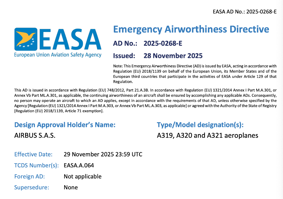 Core Points - Airbus announced a significant number of A320 aircraft are grounded due to flight control software vulnerability to strong solar radiation [1][3] - Approximately 6,000 aircraft are affected and will undergo urgent repairs [1][3] Group 1: Incident Details - Analysis of a recent incident involving an A320 aircraft revealed that strong solar radiation could corrupt critical data relied upon by the flight control system [3] - The incident referenced involved a JetBlue Airways A320 that experienced a sudden altitude drop on October 30, injuring several passengers [3] Group 2: Impact on Airlines - Over half of the global A320 fleet is impacted, leading to flight cancellations and delays for multiple airlines [5] - American Airlines, the largest A320 operator, reported that about 340 of its 480 A320 aircraft require repairs, with most expected to be completed by November 29 [5] - Avianca Airlines indicated that over 70% of its fleet, approximately 100 aircraft, will face significant disruptions in the next 10 days, prompting a suspension of ticket sales until December 8 [5] Group 3: Repair and Maintenance Challenges - The repair process primarily involves reverting to an earlier software version, which is relatively simple, but requires aircraft to be moved to maintenance centers [3][5] - Approximately 1,000 aircraft will need hardware replacements, with operations expected to take several weeks [3] - The current peak travel season and a backlog of aircraft awaiting engine repairs or inspections may exacerbate the situation, leading to widespread flight disruptions [5]