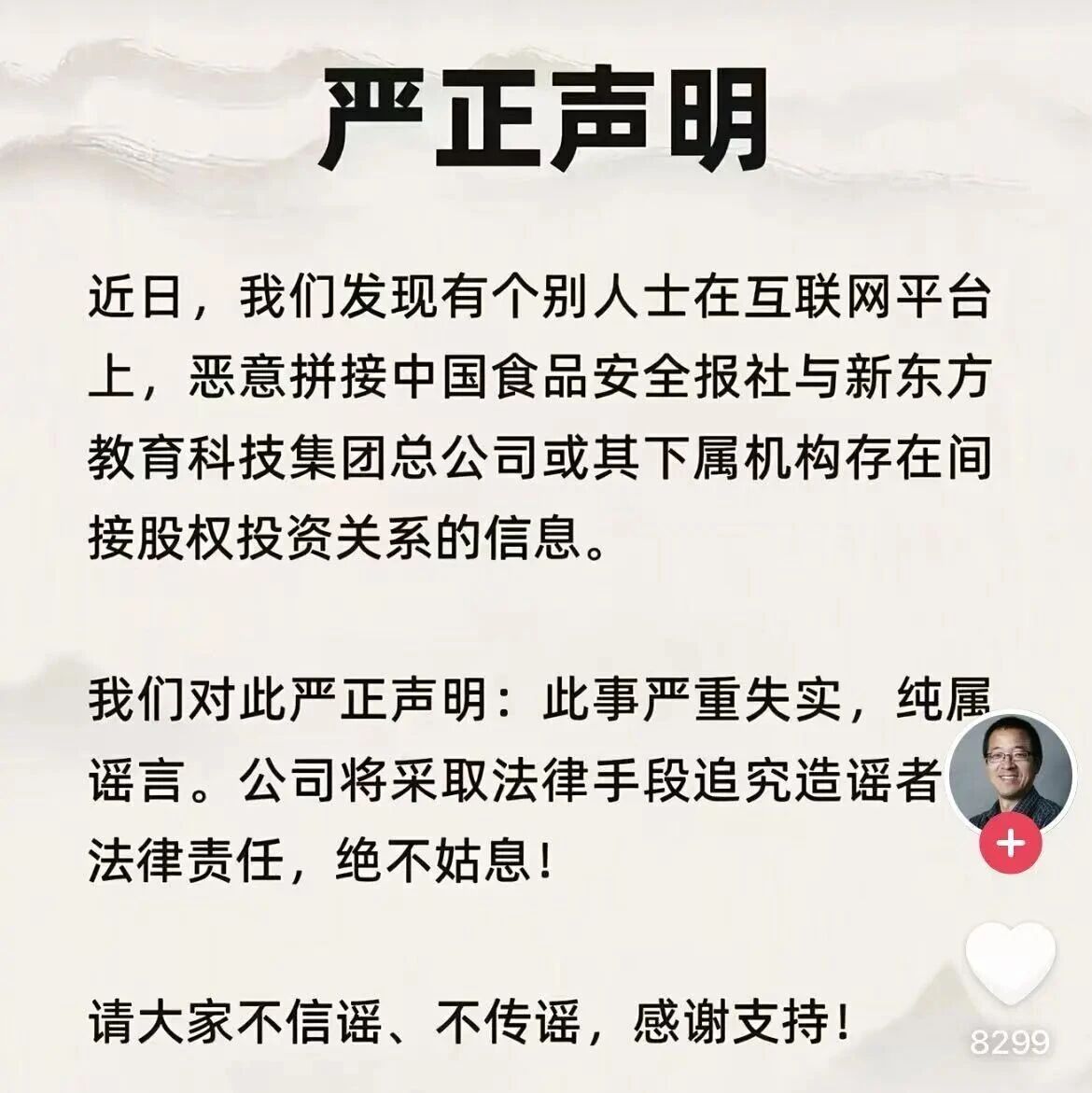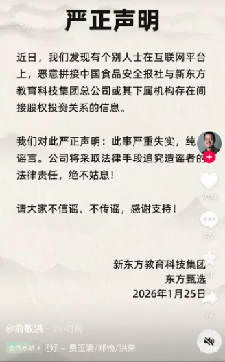 1月26日,俞敏洪个人社交账号发布严正声明称,近日,公司发现有个别人士在互联网平台上,恶意拼接中国食品安全报社与新东方教育科技集 团总公司或其下属机构存在间接股权投资关系的信息。此事严重失实,纯属谣言。 俞敏洪最新发声。 公司将采取法律手段追究造谣者的法律责任,绝不姑息。 转载与合作可联系证券时报小助理,微信ID:SecuritiesTimes END 公开信息显示,中国食品安全报社成立于1994年8月,是我国食品安全领域国家级专业性新闻媒体,由中国食品工业协会主办。 综合自:俞敏洪抖音账号、长安街知事 责编:万健祎 校对: 刘榕枝 版权声明 证券时报各平台所有原创内容,未经书面授权,任何单位及个人不得转载。我社保留追 究相关 行 为主体法律责任的权利。 点击关键字可查看 潜望系列深度报道丨 股事会专栏 丨 投资小红书 丨 e公司调查 丨 时报会客厅 丨 十大明星私募访谈 丨 涨停潮!A股有色金属板块爆发 丨 金价,大涨!突 破5000美元/盎司 丨 腾讯宣布:春节分10亿元现金 丨 688115,终止重大资产重组! 丨 两大牛股,停牌核查!深交所已暂停部分投资者交易 丨 002155, 披露重组预案!明日复 ...