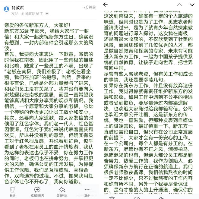 11月23日,据媒体报道,俞敏洪又写了一封主题为"让我们一起努力"的全员信,再次向员工道歉,并详 细解释了自己写信的缘由和初衷。 俞敏洪表示,如果在新东方工作,并且没有放弃这份工作,就有责任维护新东方的发展和形象。如果工 作中遇到不公平的待遇或者受到欺负,要尽量通过内部渠道解决,也欢迎大家随时给其邮箱写信。 俞敏洪称,很多老师熬夜备课,"我相信我熬夜的时间一定不比你少,只不过我熬夜的工作内容和你有 所不同"。 来源 | 智通财经 南极旅游。来源:俞敏洪社交媒体 俞敏洪首先向员工表达了歉意,写信时在南极,因此用了一些南极的描述和比喻,触发了一些员工的不 满,并没有要向大家炫耀在南极的意思,而是一直希望能够真诚和大家分享观点和情况。"一个愿意和 大家分享的老板,总比一个神秘的老板更加让员工放心和安心。"对于用红色字体,俞敏洪也道歉。老 一代人,红色基因很深。红色对于老一代人来说代表着喜庆和欢庆,所以并没有别的意思。 对于"用员工的血汗钱旅游"的说法,俞敏洪认为这样的表达不妥,你在努力工作的同时,老板们也在拼 命努力,并承担更大的风险,确保公司的正常发展,为你提供工作保障,是互相成就、互相合作、双向 选择的过程。 ...