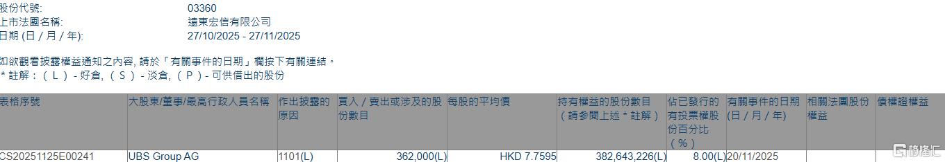 | 股份代號: | 03360 | | --- | --- | | 上市法國名稱: | 遠東宏信有限公司 | | 日期 (日 / 月 / 年): | 27/10/2025 - 27/11/20 | | 表格序號 | 大股東/董事/最高行政人員名稱 作出披露的 買入 / 費出或涉及的股 每股的平均價 | | | | 持有權益的股份數目 佔已發行的 有關事件 | | --- | --- | --- | --- | --- | --- | | | | 原因 | 份數目 | | (請參閱上述 * 註解) 有投票權股 (日 / 月 | | | | | | | 份百分比 | | CS20251125E00241 | UBS Group AG 362.000(L) | 1101(L) | | HKD 7.7595 | 382,643,226(L) 8.00(L)20/11/2 | 格隆汇11月27日丨根据联交所最新权益披露资料显示,2025年11月20日,远东宏信(03360.HK)获UBS Group AG在场内以每股均价7.7595港元增持36.2万股, 涉资约280.89万港元。 增持后,UBS Group AG最新 ...