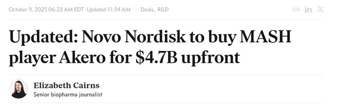来源:市场资讯 (来源:求实药社) 10月9日,Akero Therapeutics, Inc.(以下简称"Akero",纳斯达克股票代码:AKRO)今日宣布,已与诺 和诺德公司(Novo Nordisk A/S,以下简称"诺和诺德")签署最终收购协议,交易金额最高可达52亿美 元。 根据协议条款,Akero股东将在交易完成时每股获得54.00美元现金,并获得一个不可转让的或有价值权 (Contingent Value Right,简称"CVR")。每个CVR将在Akero的FGF21类似物efruxifermin(EFX)于 2031年6月30日前获得美国监管部门批准用于治疗由MASH(代谢相关脂肪性肝炎)引起的代偿期肝硬 化后,赋予持有人每股6.00美元的额外现金支付权。 这是诺和诺德新任首席执行官Mike Doustdar自7月上任以来的首个重大交易,凸显其提振销售增长、抵 御来自美国竞争对手礼来压力的决心。交易消息公布后,市场反应迅速:Akero较周三收盘价溢价约 16%。 Mike Doustdar在一份声明中表示,Akero的在研药物有潜力成为治疗代谢功能障碍相关脂肪性肝炎 (MASH)的"基石" ...