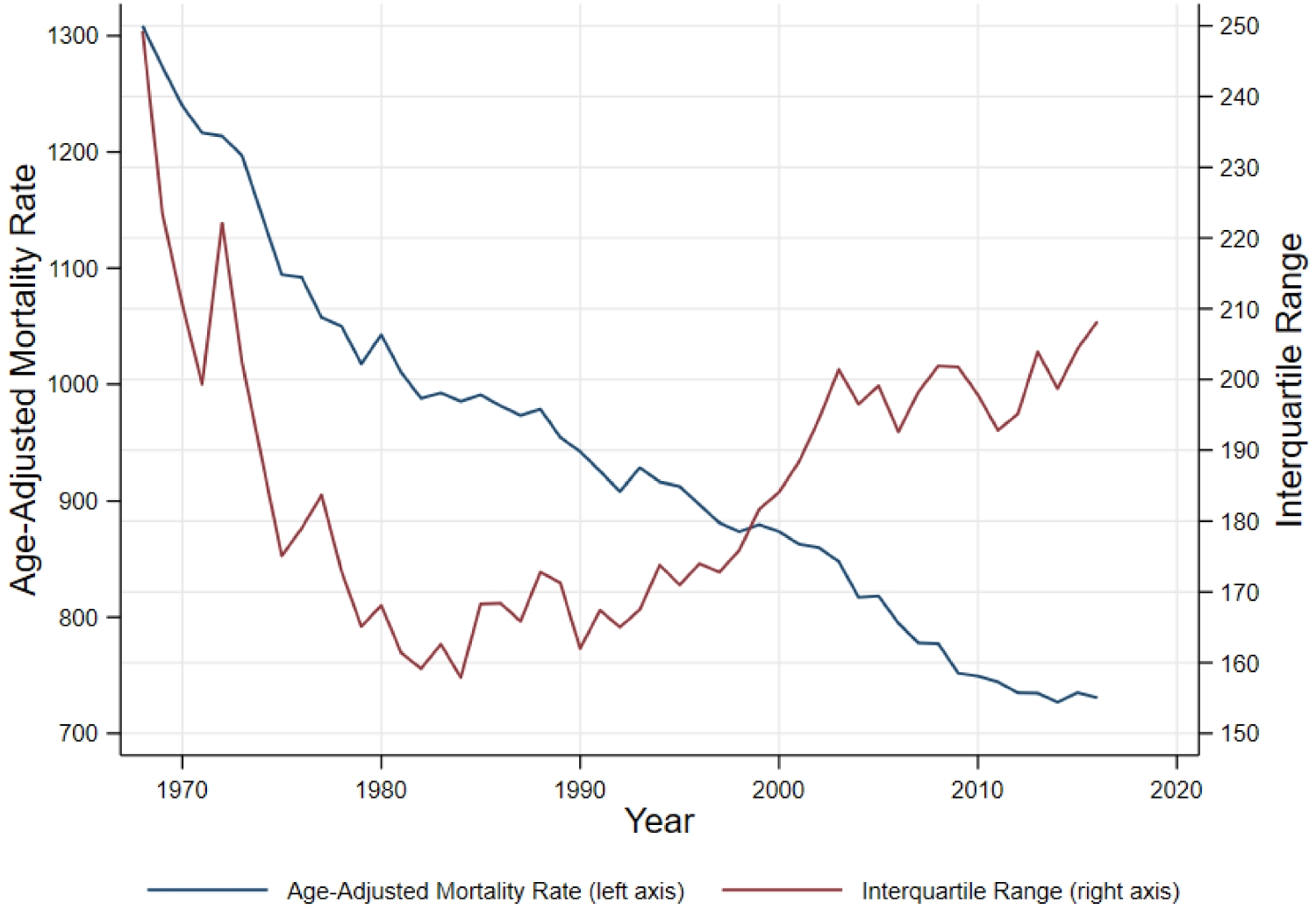 5.1 Baseline specificationsTables 1 and 2 present the marginal effects from the baseline specification in Eq. 5. Table 1 contains the results for all-cause mortality, while Table 2 presents the results for short-term mortality. The tables display the estimates (and statistical significance) of a one standard deviation increase in state and presidential liberalism. We refer to this as tests of Executive Liberalism. Similarly, we report marginal effects of a one standard deviation increase in state and federa ...