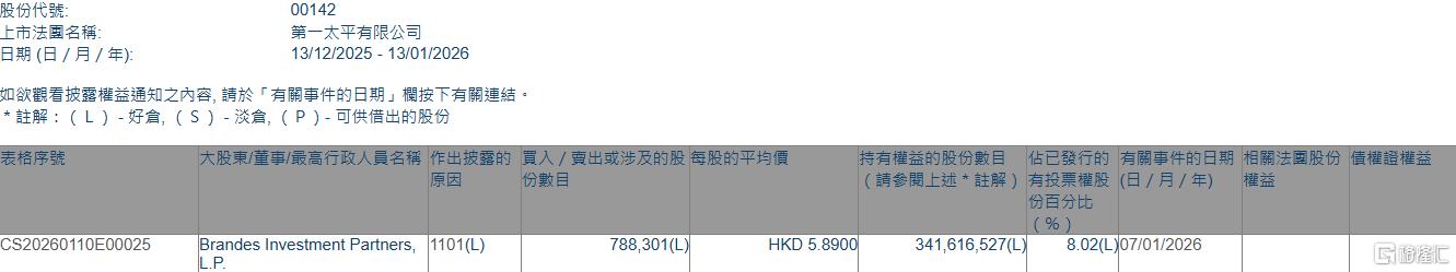 | 表格序號 | 大股東/董事/最高行政人員名稱 作出披露的 買入 / 賣出或涉及的股 每股的平均價 | | | 持有權益的股份數目 佔已發行的 有關事件的 | | | --- | --- | --- | --- | --- | --- | | | 章大 份數目 | | | (請參閱上述 *註解)有投票權股 (日/月/4 | | | | | | | 份自分比 | | | | | | | 96 ) | | | CS20260110E00025 | Brandes Investment Partners. [101(L) | 788.301(L) | HKD 5.8900 | 341.616.527(L) | 8.02(L)07/01/2026 | | 股份代號: | 00142 | | --- | --- | | 上市法國名稱: | 第一太平有限公司 | | 日期 (日 / 月 / 年): | 13/12/2025 - 13/01/2026 | 格隆汇1月13日丨根据联交所最新权益披露资料显示,2026年1月7日,第一太平(00142.HK)获Brandes Investment Partners, L.P.在 ...