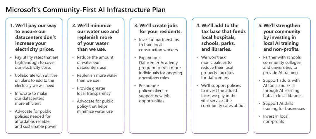 在这波AI军备竞赛中,美国科技巨头们争先投入巨资,在各地兴建动辄百亿美元的数据中心。但与此同时,围绕着数据中心所需规模庞大的电力与水资 源,科技巨头与社区民生之间的矛盾也在逐渐显现,引发了当地居民的不满与抵制。 现在微软交出了一个标准答案,展示了科技巨头应该怎样负责任地打造数据中心,实现科技创新与民生就业之间的双赢。这一波,马斯克跟不跟? 不要补贴不要退税 昨天,微软总裁布拉德·史密斯(Brad Smith)正式发布了名为"社区优先AI基础设施"的计划,提出在兴建数据中心时拒绝电力补贴,减少用水,不要退税, 解决就业,反馈社区等五点承诺。该计划旨在让微软成为社区的"好邻居",确保AI基础设施发展带来的益处大于成本,并惠及当地居民。 | 1. We'll pay our way | 2. We'll minimize | 3. We'll create jobs | 4. We'll add to the | 5. We'll strengthen | | --- | --- | --- | --- | --- | | to ensure our | our water use and | for vour r ...