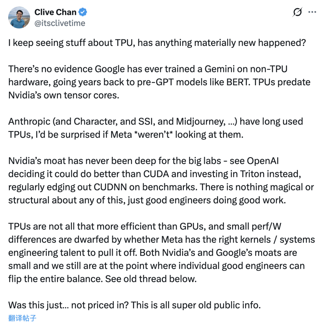 《华尔街日报》将其视为谷歌向英伟达的市场主导地位发起冲击的信号。 克雷西 发自 凹非寺 量子位 | 公众号 QbitAI 学术界看不下去了,直接戳破: 华尔街在尬吹谷歌TPU ! 起因是Meta被曝要和谷歌签订数十亿美元的TPU订单,消息曝出后英伟达盘中最大跌幅达到了7%,按照现在的市值计算,一举蒸发了超 3000亿美元。 反观谷歌,在盘中情绪最热烈时涨幅一度达4%,换算成市值相当于增加了约1500亿美元,合人民币超1万亿。 但在从业人士看来,华尔街对此举的看法实在是外行了:Meta、xAI在内的大公司和学术界多年一直在用TPU,市场突然就拿他当成算力救世 主了? OpenAI技术人员 Clive Chan 表示,不仅谷歌自己的Gemini一直在TPU上训练,像Claude、生图模型MidJourney、Ilya的SSI,也全都用 过TPU。 所以在他看来,Meta和谷歌签TPU订单不是什么奇怪的事,如果Meta没用过的话,反而会更让他惊讶。 谷歌没有护城河,英伟达也没有 Clive对Meta的看法也被现实验证——没过多久谢赛宁就亲口证实, Meta早在2020年就已经开始使用TPU了 。 谢赛宁介绍,当时何 ...