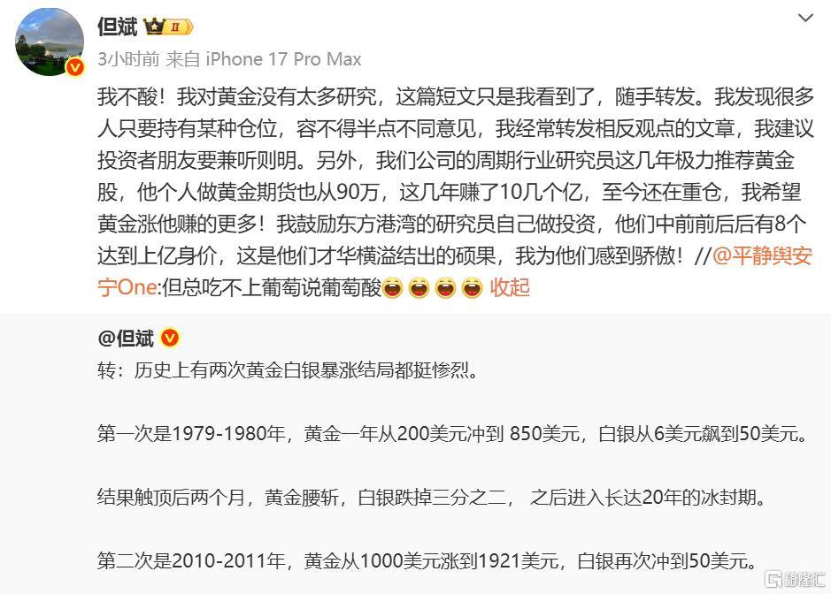 黄金已经涨疯了! 今早,COMEX黄金一度突破5600美元,伦敦金现逼近5600美元,前者在短短4个交易日内,连破7道整百关口,涨势之迅猛引发全球关注。 但斌此时转发了一篇分析"历史上黄金白银暴涨后惨烈结局"的短文,被网友反击:"吃不上葡萄说葡萄酸。" 对此,他再次回应:"我不酸!我对黄金没有太多研究。" 其中的观点是:黄金是保值资产,价格反映的是阶段性的供求变化,长期跑不赢生息资产。 对于近两年地缘冲突对黄金投资价值的影响,但斌认为这不好评估。 "黄金,我们其实没有太关注,就像巴菲特说的,黄金就是保值,其实过去200年黄金就是保值,因为它不是生息资产,长期跑不赢生息资产, 所以我们倒没有太买这些东西。这两年它又加了一个地缘政治问题,你想我们央行买了这么多、全世界都在买黄金,可能会导致阶段性的变 化,也行未来两年,惊涛骇浪来了呢?那它可能又涨,这个东西不好说。" 对于但斌更好看的生息资产,恰好其执掌的东方港湾海外基金最新美股持仓曝光,四季度大动作不断,最大的亮点是谷歌超越英伟达,成为第一大重仓 股。 截至2025年末,东方港湾海外基金共持有10只美股标的,持股市值合计13.16亿美元,折合人民币超91亿元。 ...