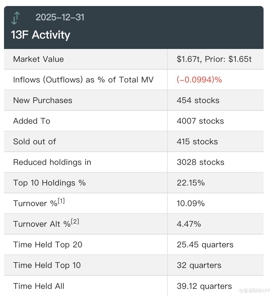 根据美国证券交易委员会(SEC)披露,摩根士丹利递交了截止至2025年12月31日的第四季度持仓报告(13F)。整体来看,大摩Q4持仓变化呈现出"维持 核心科技主线、降低指数化敞口、强化主动精选能力"的特征。 据统计,大摩第四季度持仓总市值为1.67万亿美元,上一季度总市值为1.65万亿美元,环比上升1.2%。该基金在第四季度的投资组合中新增了 454只个股,增持了4007只个股,减持了3028只个股,清仓了415只个股。其中前十大持仓标的占总市值的22.15%。 在 其 他 科 技 股 中 , Meta(META.US) 获 得 了 约 82 万 股 增 持 , 特 斯 拉 (TSLA.US) 被 减 持 了 36 万 股 , AMD(AMD.US) 被 减 持 了 502 万 股 , Palantir(PLTR.US)被减持了103万股,博通(AVGO.US)被减持了近4.4万股。 整体来看,大摩并未显著降低对科技板块的配置权重,而是通过内部调仓进行再平衡,更偏向于盈利确定性与现金流稳定性较强的龙头公司。 减持方面,大摩还减持了医疗股如强生(JNJ.US)、艾伯维(ABBV.US)、赛默飞世尔(TMO.U ...