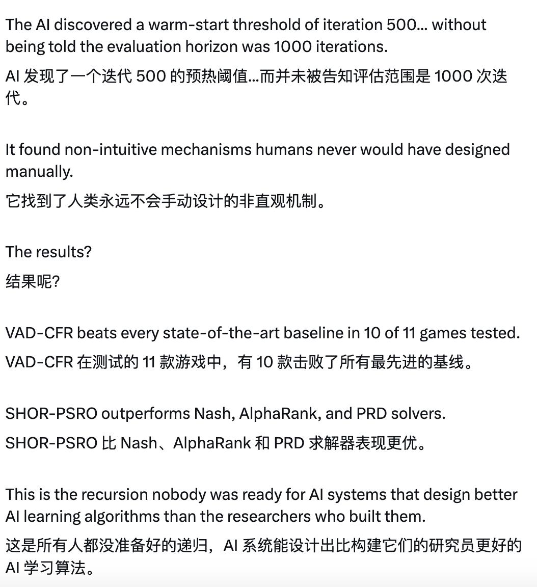 说起 AI Coding,之前很多人好歹还有个"心理安慰": AI 也就写写"脚手架代码"、补补前端页面,真到核心算法、业务逻辑,还是得人来。 但这道"最后防线",也正在松动。 谷歌 DeepMind 最近做了一件更狠的事:他们让 LLM 驱动的智能体,直接去改写、进化算法代码本身——不是调参数,而是改算法逻辑。 改完就丢进真实博弈环境里反复跑,自动评测、优胜劣汰,一轮轮进化。 结果呢?它真的做出了全新的多智能体学习算法,在多项测试中超过了人类专家手工打磨的版本。 重要的是,这些机制并不直观,属于人类很难靠经验穷举出来的解。 更关键的是:人只用定义好了算法骨架,之后的搜索、修改、筛选,全程自动完成,不用手调参数,不用反复试错,也不靠研究者的直觉微调。 这个 AlphaEvolve 本身去年就有,但这是它 第一次被用来学习算法。 它把 Gemini 系列大模型,和进化搜索结合起来,把代码不断生成、测试、筛选、再进化。 这个智能体叫 AlphaEvolve,延续了 DeepMind 一贯的"Alpha"命名传统(AlphaGo、AlphaZero、AlphaFold)。其中 "Evolve" 意为"进化",点明它 ...