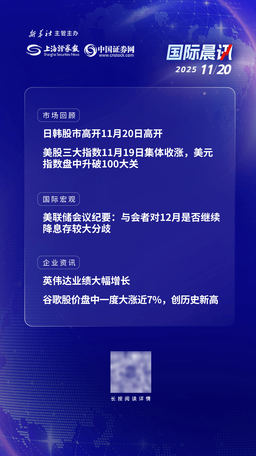 新 3 社 主管主办 上海診券系 (2)中国证券网 2025 11/20 市场回顾 日韩股市高开11月20日高开 美股三大指数11月19日集体收涨,美元 指数盘中升破100大关 国际宏观 美联储会议纪要:与会者对12月是否继续 降息存较大分歧 企业资讯 英伟达业绩大幅增长 【市场回顾】 北京时间11月20日,日韩股市高开。日经225指数开盘上涨591.59点,涨幅为1.22%,报49129.29点;韩国KOSPI指数开盘上涨101.46点,涨幅为2.58%,报 4030.97点。 当地时间11月19日,美股三大指数集体收涨。截至收盘,道琼斯指数涨0.10%,报46138.77点;纳斯达克指数涨0.59%,报22564.23点;标普500指数涨 0.38%,报6642.16点。 欧洲三大股指11月19日全线收跌。英国伦敦股市《金融时报》100种股票平均价格指数19日报收于9507.41点,较前一交易日下跌44.89点,跌幅为0.47%。 法国巴黎股市CAC40指数报收于7953.77点,较前一交易日下跌14.16点,跌幅为0.18%。德国法兰克福股市DAX指数报收于23162.92点,较前一交易日下 跌17.6 ...