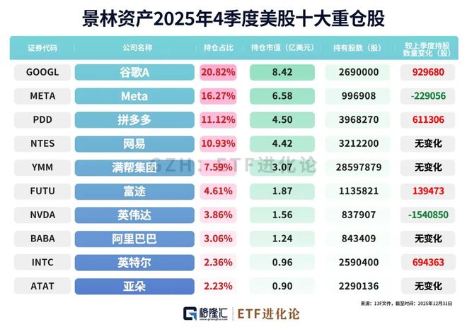 智通财经获悉,根据美国证券交易委员会(SEC)披露,景林资产递交了截至2025年12月31日的第四季度 持仓报告(13F)。其在四季度大幅减持英伟达,谷歌升至第一重仓。 具体来看,景林资产第四季度持仓总市值为40.4亿美元,上一季度总市值为44.4亿美元。在第四季度的 持仓组合中,该基金新增1只个股,增持5只个股;同时清仓了3只个股,减持10只个股。其中,前十大持 仓标的占总市值的82.58%。 在前十大重仓股中,Alphabet Inc. (GOOGL.US) 位列第一,持仓约269.00万股,持仓市值约8.42亿美 元,占投资组合比例为20.82%,较上季度持仓数量增加约92.97万股。 Meta Platforms Inc. (META.US) 位列第二,持仓约99.69万股,持仓市值约6.58亿美元,占投资组合比例 为16.27%,较上季度持仓数量减少约22.91万股。 拼多多 (PDD.US) 位列第三,持仓约396.83万股,持仓市值约4.50亿美元,占投资组合比例为11.12%, 较上季度持仓数量增加约61.13万股。 网易 (NTES.US) 位列第四,持仓约321.22万股,持仓市值约4.4 ...
