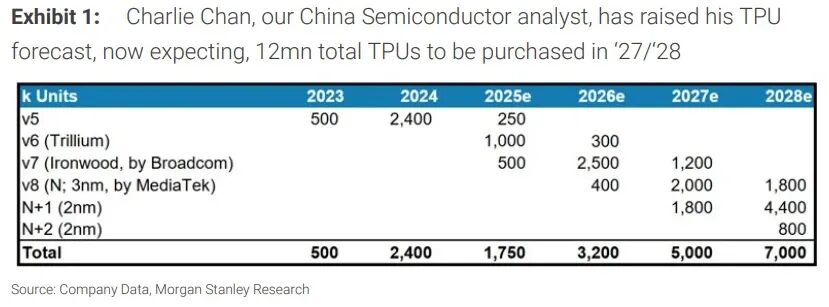 硬·AI 作者 | 龙 玥 编辑 | 硬 AI 在AI芯片的激烈竞赛中,谷歌的自研TPU正显露出挑战现有市场格局的巨大潜力。 该行基于供应链端的最新排查,将谷歌TPU在2027年和2028年的产量预测大幅上调。2027年的预测从约300万块上调至约500万块,增幅约67%。 谷歌TPU若开启"外销"模式,将为其开辟新的巨大收入来源。报告测算, 每销售50万块TPU芯片,就有可能在2027年为谷歌增加约130亿美元的收入和0.40美元 的每股收益(EPS) 。 01 供应链信号 2027-2028年产量预期翻倍 根据大摩亚洲半导体分析师Charlie Chan的监测,供应链端传出了明确的TPU订单增加信号。基于此,大摩对未来的TPU供应量进行了修正: 2027年TPU产量预测 :从此前的约300万块,大幅上调至 约500万块 ,增幅高达约 67% 。 2028年TPU产量预测 :从此前的约320万块,飙升至 约700万块 ,增幅更是达到了惊人的 120% 。 报告指出,这意味着仅在2027至2028两年间,谷歌就将获得 1200万块 TPU的供应,而相比之下,过去4年的总量仅为790万块。两年内的产量激增,预示 ...