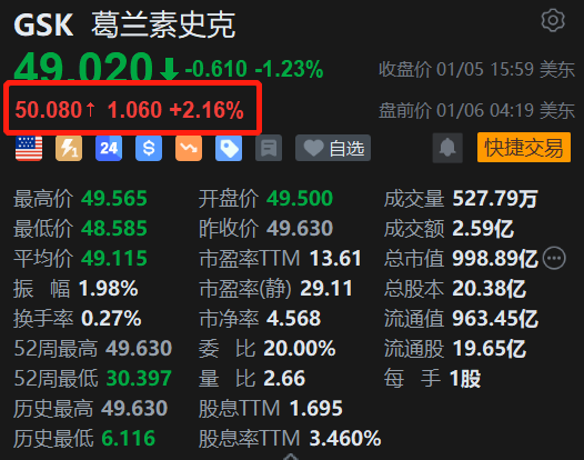| GSK 葛兰素史克 | | | | --- | --- | --- | | 49 020 4 -0.610 -1.23% | | 收盘价 01/05 15:59 美东 | | 50.080 ↑ 1.060 +2.16% | | 盘前价 01/06 04:19 美东 | | 三 7 24 S m 9 日 ♥ 白选 | | ● 快捷交易 | | 最高价 49.565 | 开盘价 49.500 | 成交量 527.79万 | | 最低价 48.585 | 昨收价 49.630 | 成交额 2.59亿 | | 平均价 49.115 | 三容率 13.61 | 总市值 998.89亿 (…) | | 振 幅 1.98% | 市盈率(静) 29.11 | 总股本 20.38亿 | | 换手率 0.27% | 市净率 4.568 | 流通值 963.45亿 | | 52周最高 49.630 | 委 比 20.00% | 流通股 19.65亿 | | 52周最低 30.397 | 量 比 2.66 | 每 手 1股 | | 历史最高 49.630 | 股息TIM 1.695 | | | 历史最低 6.116 股息率TIM ...