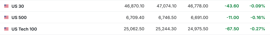 盘前市场动向 1.11月7日(周五)美股盘前,美股三大股指期货齐跌。截至发稿,道指期货跌0.09%,标普500指数期货跌0.16%,纳指期货跌 0.27%。 | = US 30 | 46,870.10 | 47,074.10 | 46,778.00 | -43.60 | -0.09% | | --- | --- | --- | --- | --- | --- | | = US 500 | 6,709.40 | 6,746.50 | 6.691.00 | -11.00 | -0.16% | | = US Tech 100 | 25,062.50 | 25,244.30 | 24,975.50 | -67.50 | -0.27% | 2.截至发稿,德国DAX指数跌1.06%,英国富时100指数跌0.85%,法国CAC40指数跌0.62%,欧洲斯托克50指数跌0.91%。 | = 德国DAX30 | 23,492.78 | 23,840.28 | 23,472.78 | -251.46 | -1.06% | | --- | --- | --- | --- | --- | --- | | 瑞 英国富时100 | 9, ...