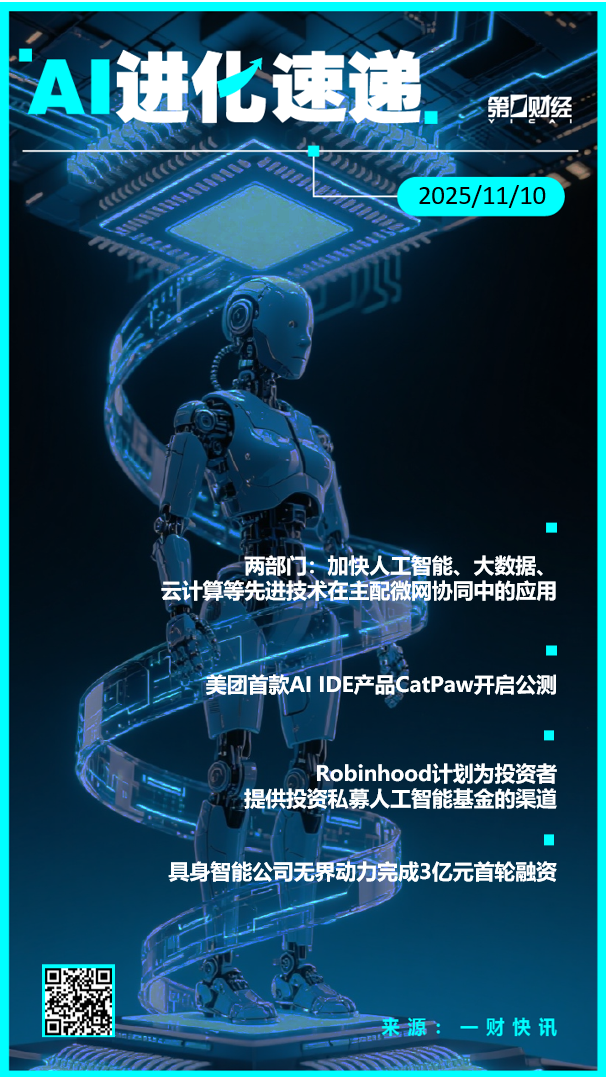 Group 1 - The core viewpoint of the articles highlights advancements in artificial intelligence and related technologies, with a focus on new product launches and funding activities in the sector [1][3] Group 2 - The two departments are accelerating the application of advanced technologies such as artificial intelligence, big data, and cloud computing in the collaborative management of microgrids [1] - Meituan has launched its first AI IDE product, CatPaw, which is now in public beta [1] - Robinhood plans to provide investors with access to private equity artificial intelligence funds [1] - The embodied intelligence company, Wujie Power, has completed a Series A financing round, raising 300 million yuan [1][3]