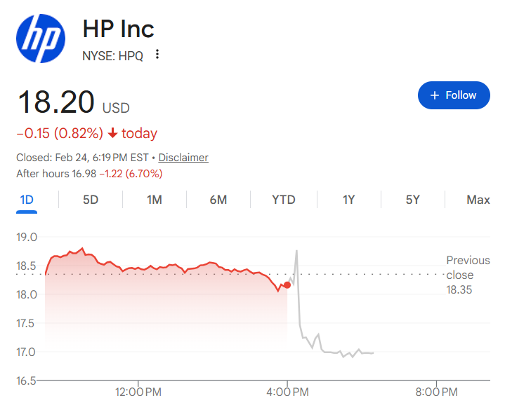 财报超预期股价却暴跌!惠普(HPQ.US)盘后重挫7% 关税与内存涨价成“利润杀手”