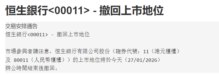 #恒生银行撤销在港上市#【#恒生银行在香港联交所上市地位正式撤销#】恒生银行在香港联交所的上市 地位27日正式撤销。恒生银行于1972年上市。退市后,恒生银行成为香港上海汇丰银行有限公司和汇丰 控股有限公司的全资附属公司。2025年10月,汇丰集团、汇丰亚太和恒生银行共同宣布,汇丰亚太拟以 协议安排方式将恒生银行私有化。2026年1月8日,汇丰集团和汇丰亚太联合公告,私有化恒生银行的计 划已在恒生银行法院会议及股东特别大会上获相关股东表决通过。(智通财经) ...