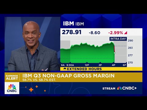 Chairman, President and CEO of IBM Arvind Krishna attends the 55th annual World Economic Forum meeting in Davos, Switzerland, on Jan. 22, 2025.IBM reported third-quarter results that topped Wall Street estimates and lifted its guidance, citing ongoing artificial intelligence tailwinds. Still, the stock dropped 5% in extended trading. Here's how the company performed versus LSEG estimates:Earnings per share: $2.65 adjusted vs. $2.45 expectedRevenue: $16.33 billion vs. $16.09 billion expected.Revenue increase ...