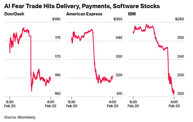 The artificial intelligence “scare trade” erupted again on Monday as growing concerns about the disruptive power of AI dragged down shares of delivery, payments and software companies, and sent International Business Machines Corp. to its worst plunge in 25 years.It began after a bearish report was published over the weekend by a little known firm called Citrini Research.The report, released on social media Sunday, outlined the potential risks to various segments of the global economy, using hypothetical sc ...