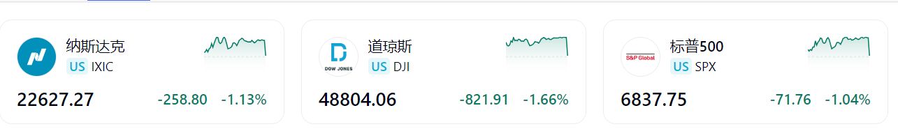 美股三大指数收盘均跌超1%,道指跌1.66%,纳指跌1.13%,标普500指数跌1.04%。大型科技股多数下 跌,微软、奈飞跌超3%,特斯拉、亚马逊、Meta跌逾2%,谷歌、英特尔跌超1%;苹果、英伟达小幅 上涨。IBM跌超13%,创2000年以来最大跌幅。诺和诺德跌超16%,在临床试验中,旗下产品CagriSema 的效果不及礼来的Zepbound。癌症细胞疗法公司Arcellx涨超77%,消息面上,吉利德科学据悉将以每股 115美元的价格收购该公司。Visa跌超4%,创去年6月份以来最大单日跌幅;MasterCard跌超5%,创去 年4月份以来最大单日跌幅。 ...
