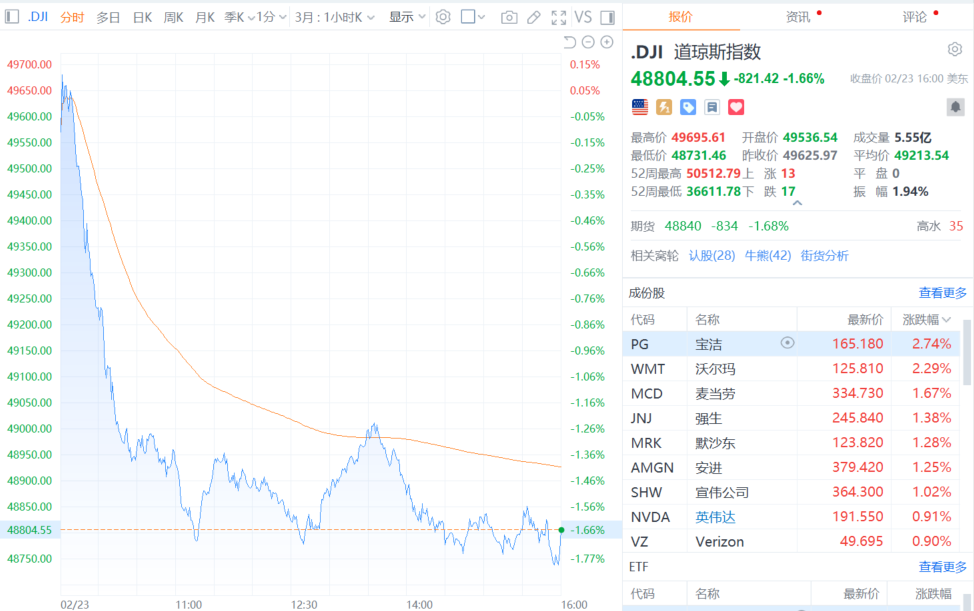 Market Overview - The three major U.S. stock indices closed lower on February 23, with the Dow Jones Industrial Average down by 821.91 points, closing at 48,804.06, a decline of 1.66% [1] - The S&P 500 index fell by 71.76 points, closing at 6,837.75, a decrease of 1.04% [1] - The Nasdaq Composite Index dropped by 258.8 points, ending at 22,627.27, a decline of 1.13% [1] Technology Sector - Major tech stocks mostly declined, with Microsoft and Netflix down over 3%, Tesla, Amazon, and Meta down more than 2%, and Google and Intel down over 1% [2] - Apple and Nvidia saw slight increases [2] - IBM experienced a significant drop of over 13%, marking its largest decline since 2000, influenced by Anthropic's Claude announcing support for COBOL-related capabilities [2] Healthcare Sector - Novo Nordisk's stock fell over 16% after its product CagriSema showed inferior results compared to Eli Lilly's Zepbound in clinical trials [4] - Arcellx, a cancer cell therapy company, surged over 77% following news that Gilead Sciences plans to acquire the company at $115 per share [4] Chinese Stocks - The Nasdaq Golden Dragon China Index declined by 0.95%, with TSMC down 0.13%, Alibaba down 1.08%, and JD down 0.66% [6] - Pinduoduo rose by 0.78%, NIO increased by 4.34%, while Futu Holdings fell by 5.55% and Yamafin Sports dropped by 3.50% [6] Commodity Market - The FTSE A50 futures index fell by 0.21%, closing at 14,866 points [7] - International oil prices decreased, with WTI crude oil futures down by $0.19, closing at $66.29 per barrel, a drop of 0.29% [7] - COMEX gold futures rose by $167.00, a 3.29% increase, closing at $5,247.90 per ounce [7] - COMEX silver futures increased by $5.66, a 6.87% rise, closing at $88.00 per ounce [7] - Spot gold rose by $123.41, a 2.42% increase, closing at $5,227.75 per ounce [7] - Spot silver increased by $3.55, a 4.19% rise, closing at $88.20 per ounce [7] Economic Indicators - The U.S. January CPI rose by 2.4% year-over-year, below market expectations of 2.5%, and down from 2.7% in December [7] - Core CPI increased by 2.5% year-over-year, with a month-over-month rise of 0.3%, both in line with expectations [7] - The Federal Reserve's January meeting minutes revealed significant internal divisions among committee members regarding inflation risks [7] Trade Policy - Following a Supreme Court ruling that deemed the Trump administration's large-scale tariff policy illegal, Trump announced a new 10% import tariff on global goods for 150 days [8] - The tariff rate was later increased to 15% [8] - Huachuang Securities noted that while short-term U.S. tariff rates may slightly decrease, the overall tariff landscape is unlikely to change significantly [8]