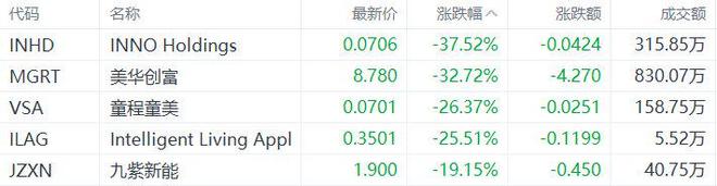 格隆汇12月19日|中概股收盘跌幅居前的个股为:INNO Holdings跌37.52%,美华创富跌32.72%,童程 童美跌26.37%,Intelligent Living Appl跌25.51%,九紫新能跌19.15%。(格隆汇) | 代码 | 名称 | 最新价 | 涨跌幅 ^ | 涨跌额 | 成交额 | | --- | --- | --- | --- | --- | --- | | INHD | INNO Holdings | 0.0706 | -37.52% | -0.0424 | 315.85万 | | MGRT | 美华创富 | 8.780 | -32.72% | -4.270 | 830.07万 | | VSA | 童程章美 | 0.0701 | -26.37% | -0.0251 | 158.75万 | | ILAG | Intelligent Living Appl | 0.3501 | -25.51% | -0.1199 | 5.52万 | | JZXN | 九紫新能 | 1.900 | -19.15% | -0.450 | 40.75万 | ...
