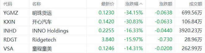 Core Viewpoint - Chinese concept stocks experienced significant declines, with notable drops in several companies' stock prices, indicating potential volatility in this sector [1] Group 1: Stock Performance - Mingzhu Logistics (YGMZ) saw a dramatic drop of 82.38%, closing at 0.187, with a trading volume of 5.5968 million [1] - INNO Holdings (INHD) fell by 43.98%, ending at 0.2695, with a trading volume of 50.1026 million [1] - Tongcheng Tongmei (VSA) decreased by 22.78%, closing at 0.1454, with a trading volume of 7.2197 million [1] - Huato Financial (WTF) dropped by 20.34%, finishing at 2.820, with a trading volume of 0.8505 million [1] - Mint (MIMI) declined by 17.00%, closing at 0.4600, with a trading volume of 1.0841 million [1]