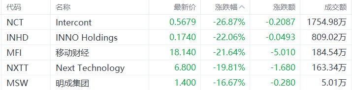 | 代码 | 名称 | 最新价 | 涨跌幅 ^ | 涨跌额 | 成交额 | | --- | --- | --- | --- | --- | --- | | NCT | Intercont | 0.5679 | -26.87% | -0.2087 | 1754.98万 | | INHD | INNO Holdings | 0.1740 | -22.06% | -0.0493 | 809.02万 | | MFI | 移动财经 | 18.140 | -21.64% | -5.010 | 184.54万 | | NXTT | Next Technology | 6.800 | -19.81% | -1.680 | 163.34万 | | MSW | 明成集团 | 1.400 | -16.67% | -0.280 | 5.01万 | 中概股收盘跌幅居前的个股为:Intercont跌26.87%,INNO Holdings跌22.06%,移动财经跌21.64%, Next Technology跌19.81%,明成集团跌16.67%。(格隆汇) ...