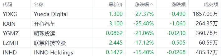 美股异动丨Yueda Digital跌27.37%,为跌幅最大的中概股
