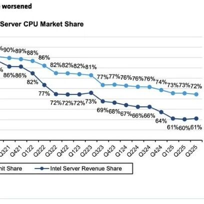 赢家与输家:销售图表长期以来都显示,AMD正在稳步蚕食英特尔的CPU市场份额。然而,最近的 分析表明,苹果向自研Arm架构处理器的转型加剧了这一趋势,这家库比蒂诺巨头的笔记本电脑CPU 如今的销量几乎与英特尔的产品不相上下。 公众号记得加星标⭐️,第一时间看推送不会错过。 英特尔的市场份额在八年内从大约90%下降到60%。 Desktop CPU Unit Share 100% 90% 80% 70% 60% 50% 40% 30% 20% 10% 0% Intel ARM (AAPL) 根据Citrini Research获取的Mercury Research和Bernstein Research的最新数据,苹果笔记本电脑 CPU的市场份额已达到约20%,与AMD持平。自2018年以来,这两家公司合计已将英特尔的市场份 额拉低了20%以上。台式机领域的情况也类似,尽管AMD在该领域的影响力远超苹果。 2018 年之前,英特尔占据了桌面 CPU 市场约 90% 的份额,笔记本电脑 CPU 市场超过 80% 的份 额。尽管该公司在这两个领域仍然拥有 60% 的市场份额,但自 2017 年推出 Zen 处理器以来 ...