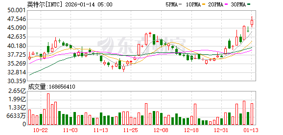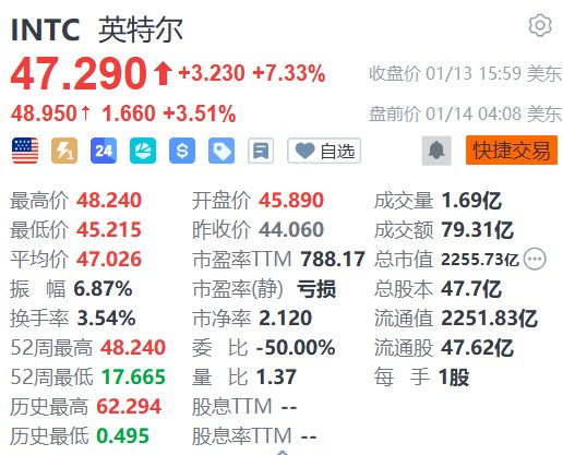 | INTC 英特尔 | | | --- | --- | | 47 .290 + +3.230 +7.33% | 收盘价 01/13 15:59 美东 | | 48.950 ↑ 1.660 +3.51% | 盘前价 01/14 04:08 美东 | | 三 24 24 4 8 8 8 日 | ● 快捷交易 | | 最高价 48.240 | 开盘价 45.890 成交量 1.69亿 | | 最低价 45.215 | 昨收价 44.060 成交额 79.31亿 | | 平均价 47.026 | 市盈率TM 788.17 总市值 2255.73亿(---) | | 振 幅 6.87% | 市盈率(静) 亏损 总股本 47.7亿 | | 换手率 3.54% | 市净率 2.120 流通值 2251.83亿 | | 52周最高 48.240 | 委 比 -50.00% 流通股 47.62亿 | | 52周景低 17.665 | 量 比 1.37 每 手 1股 | | 历史最高 62.294 | 股息TIM -- | | 历史最低 0.495 | 股息率ITM -- | 昨日收涨7.33%的英特尔(INTC.US)今日美 ...