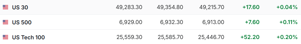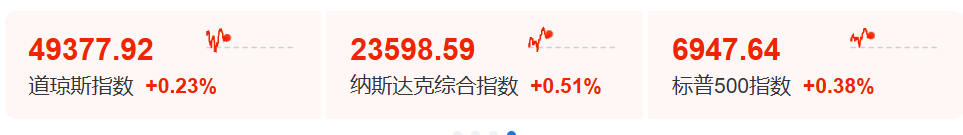 1. 1月9日(周五)美股盘前,美股三大股指期货齐涨。截至发稿,道指期货涨004%,标普500指数期货涨0.11%,纳指期货涨0.20%。 | ■ US 30 | 49,283.30 | 49,354.80 | 49,215.70 | +17.60 | +0.04% | | --- | --- | --- | --- | --- | --- | | ■ US 500 | 6,929.00 | 6,932.30 | 6,913.00 | +7.60 | +0.11% | | ■ US Tech 100 | 25,559.30 | 25,585.70 | 25,446.70 | +52.20 | +0.20% | 2. 截至发稿,德国DAX指数涨0.41%,英国富时100指数涨0.52%,法国CAC40指数涨0.86%,欧洲斯托克50指数涨1.06%。 | I 德国DAX30 | 25,228.32 | 25,269.21 | 25,106.61 | +102.41 | +0.41% | | --- | --- | --- | --- | --- | --- | | 器 英国富时100 | 10,097.20 | ...