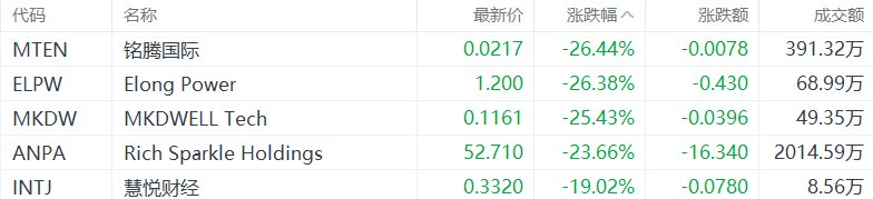 中概股收盘跌幅居前的个股为:铭腾国际跌26.44%,Elong Power 跌26.38%,MKDWELL Tech跌25.43%,Rich Sparkle Holdings 跌23.66%,慧悦财经跌19.02%。(格隆汇) | 代码 | 名称 | 最新价 | 涨跌幅 ^ | 涨跌额 | 成交额 | | --- | --- | --- | --- | --- | --- | | MTEN | 铭腾国际 | 0.0217 | -26.44% | -0.0078 | 391.32万 | | ELPW | Elong Power | 1.200 | -26.38% | -0.430 | 68.99万 | | MKDW | MKDWELL Tech | 0.1161 | -25.43% | -0.0396 | 49.35万 | | ANPA | Rich Sparkle Holdings | 52.710 | -23.66% | -16.340 | 2014.59万 | | INTJ | 慧悦财经 | 0.3320 | -19.02% | -0.0780 | 8.56万 | ...