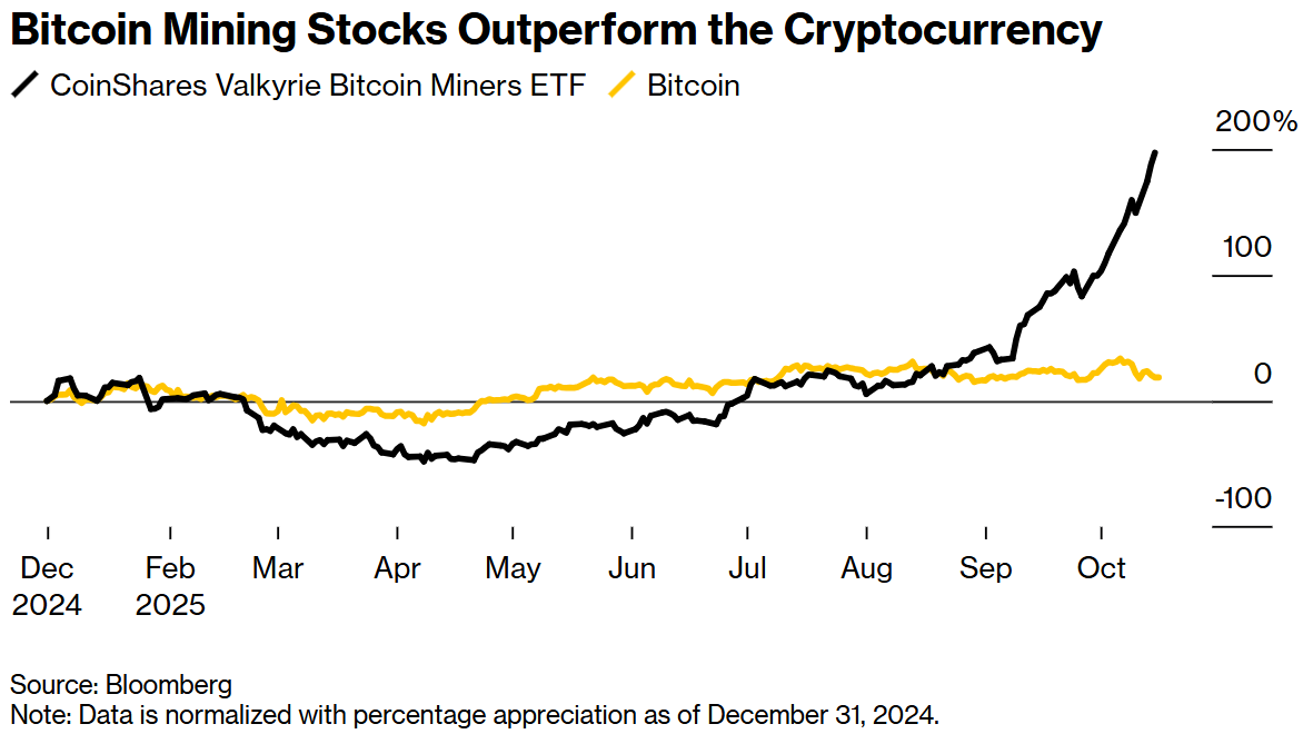 尽管过去一周加密货币市场遭遇暴跌,但比特币在2025年仍上涨约14%,且距离本月早些时候创下的近 12.6万美元的历史高点不远。自特朗普第二届政府支持加密货币议程以来,投资者纷纷涌入比特币。 不过,今年加密货币复苏的最大赢家不是比特币持有者,而是矿企本身。一只追踪上市矿企的基金今年 迄今已飙升逾150%。与过去比特币上涨时矿企也会跟着上涨的周期不同,这些公司现在被视为科技基 础设施公司,因为它们正朝着这个方向转型。 比特币矿业股表现优于加密货币 Needham & Co.的分析师约翰•托达罗表示:"眼下,投资者对比特币矿企的估值几乎完全基于它们在高 性能计算/人工智能领域的机遇。在我们关于矿企的对话中,只有不到10%实际上是在谈论比特币和挖 矿。" Cipher Mining Inc.(CIFR.US)和IREN Ltd.(IREN.US)是这种趋势的典型代表。随着这两家纳斯达克上市的 公司从纯粹开采比特币转向人工智能基础设施,它们的股价今年分别飙升约300%和500%。 2025年初,Cipher与部分得到谷歌支持的Fluidstack签署了一份为期10年、价值约30亿美元的托管协议, 后者保证了14亿美元 ...